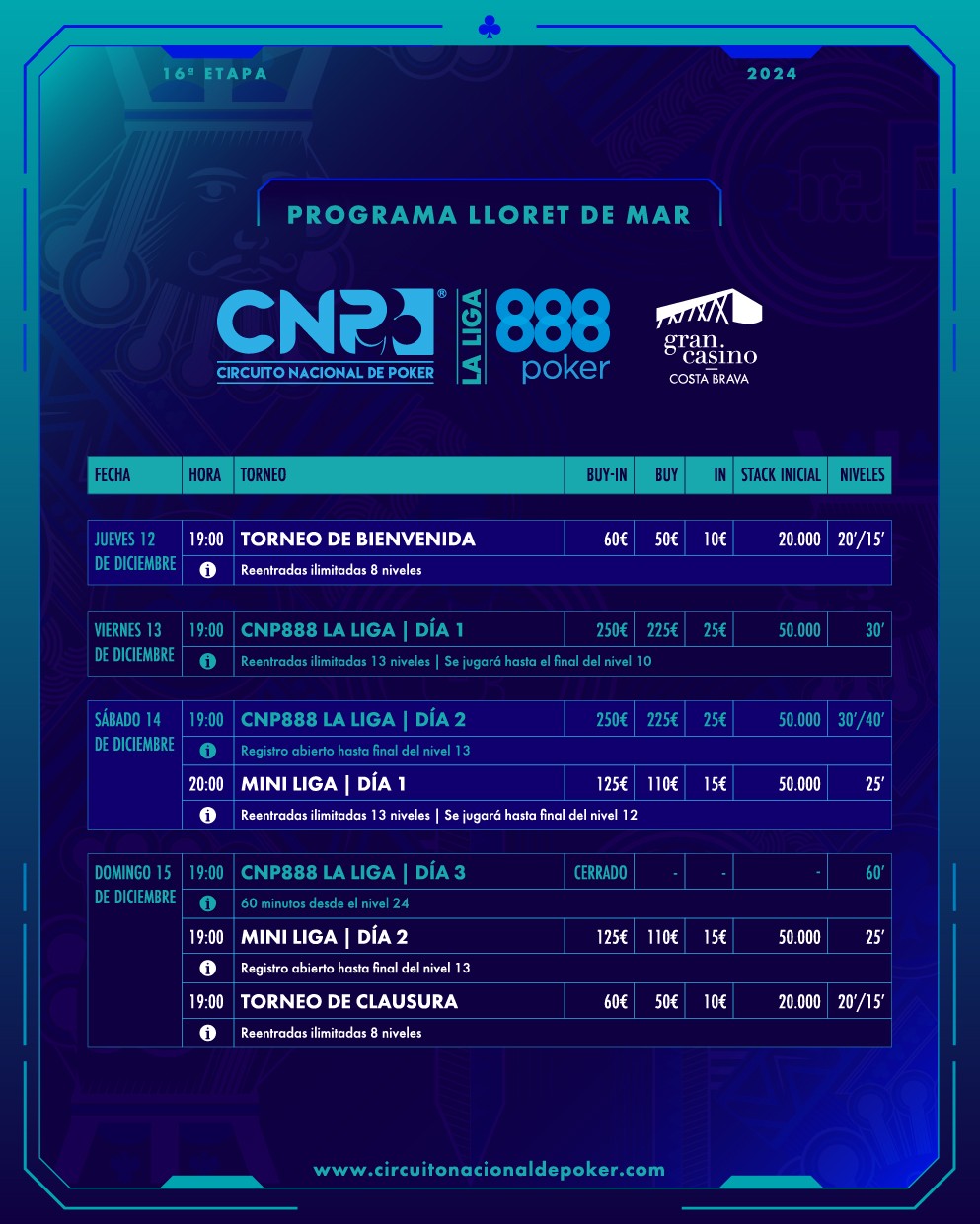 CNP888 – LA LLIGA – 16ª ETAPA Compra les teves entrades aquí: TORNEIG DE BENVINGUDA CNP888 LA LIGA – DIA 1 CNP888 LA LIGA – DIA 2 MINI LLIGA – DÍA 1 MINI LLIGA – DÍA 2 TORNEIG DE CLAUSURA